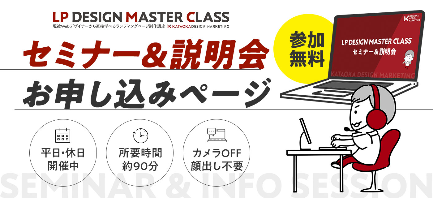 現在、「LPデザインマスタークラス」へのお申し込みは、セミナー&説明会(無料)にご参加頂いた方のみ対象とさせて頂いております。