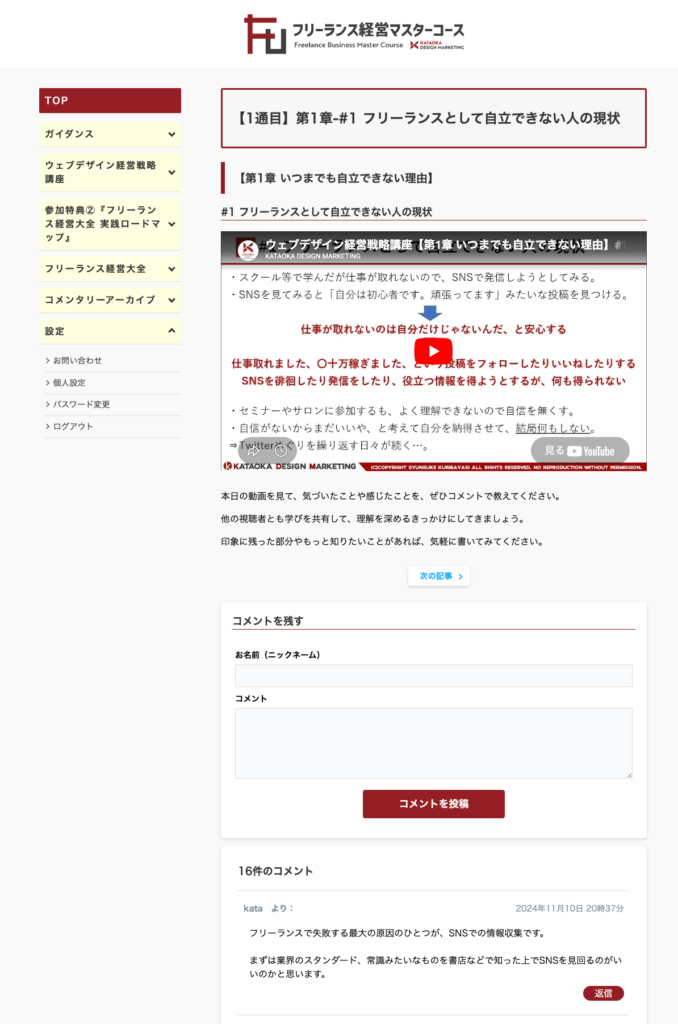 フリーランス経営マスターコースでは、1本10〜15分程度の短い動画を1日1本、コメント付きで少しずつ学ぶスタイルを採用しています。