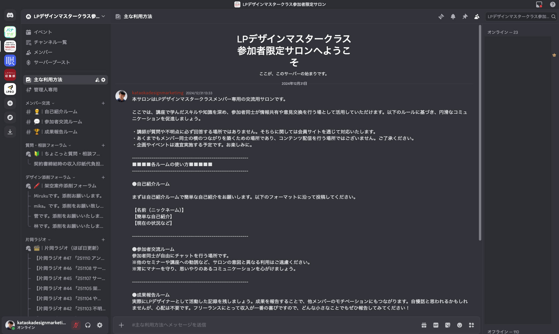 LPデザインマスタークラスでは、定期開催のオンラインMTGに加え、日々学習を継続したり、参加者同士で交流を図るために「LPデザインマスタークラス参加者限定オンラインサロン(Discord)」を運営しております。