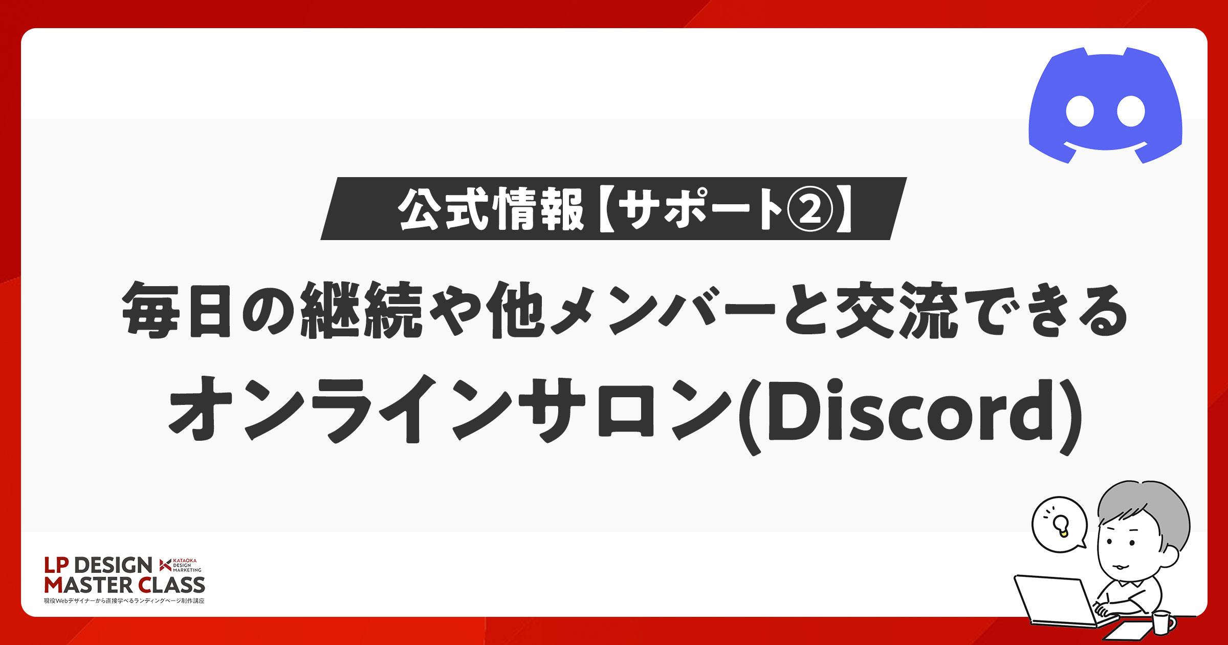 LPデザインマスタークラスでは、参加メンバーが日常的に学習を継続したり、他の参加メンバーとの交流を深めて頂くことを目的として、「LPデザインマスタークラス参加者限定オンラインサロン(Discord)」を運営しております。