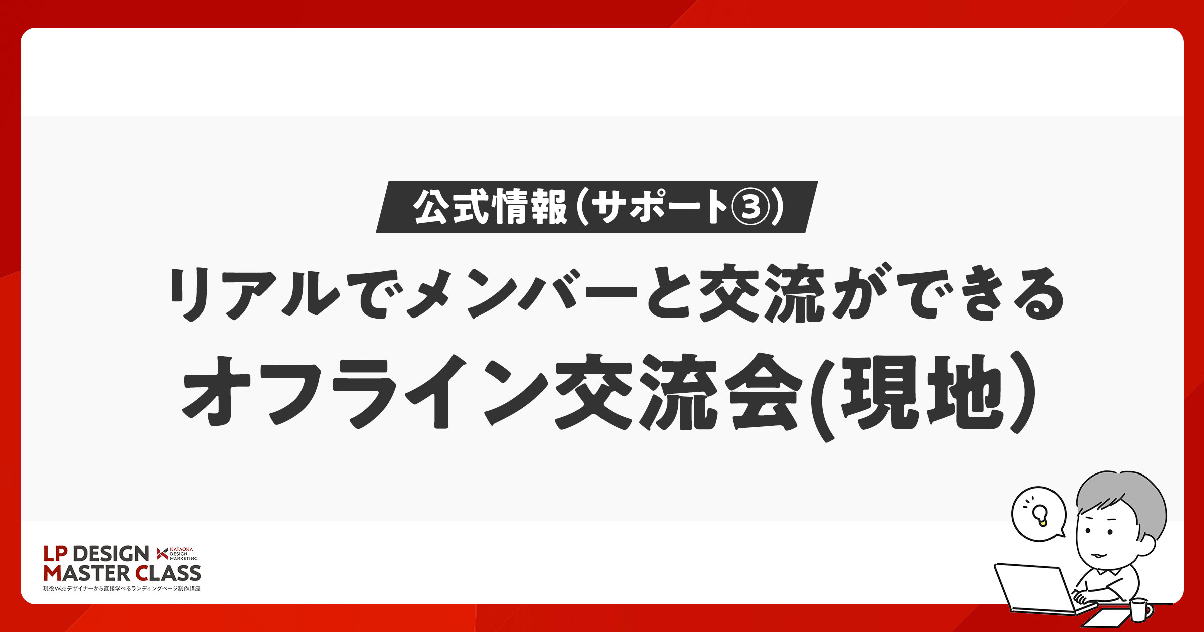 LPデザインマスタークラスが定期的に実施予定の「オフライン交流会」は、主に東京や大阪などを中心に片岡が直接リアルで開催するメンバー限定の交流会です。